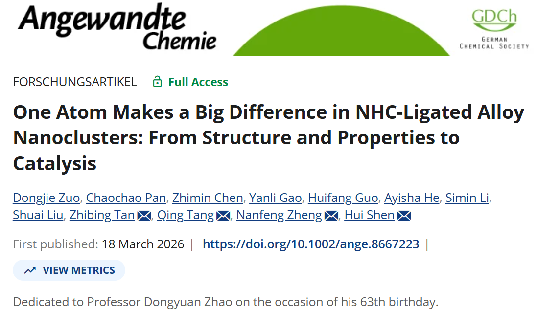 近日,我院谭志冰研究员团队与厦门大学郑南峰院士、内蒙古大学能源材料化学研究院沈慧研究员和重庆大学唐青研究员等人合作在国际顶级期刊Angewandte Chemie International Edition发表论文“One Atom Makes a Big Difference in NHC-Ligated Alloy Nanoclusters: From Structure and Properties to Catalysis”。