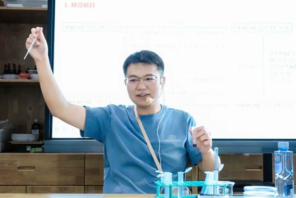 在显色反应实验中,师生团队引导同学们运用刃天青试纸定量检测饮料中维生素C含量,通过颜色变化理解氧化还原反应的实质,并将检测过程与艺术创作相结合,在严谨的科学实验中融入趣味元素。